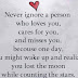 Đừng nên bỏ quên một người yêu thương bạn, chăm sóc cho bạn, nhớ đến bạn, bởi có một ngày bạn tỉnh dậy và nhận ra rằng: Bạn đã đánh mất c...